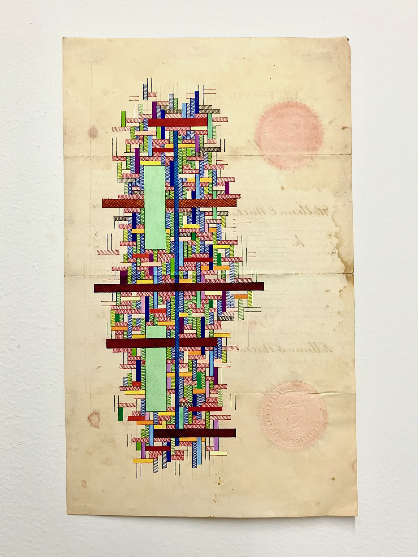 Untitled, Color pencil, ink, found document, 8 1/2" x 13 5/8", 2004 (DNA-04-675)